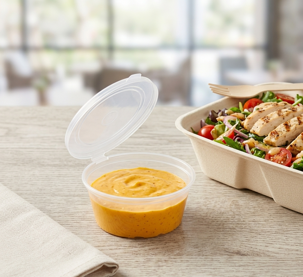 Plastikinė padažinė 60 ml su sujungtu dangteliu – pagaminta iš kokybiško plastiko, tačiau pakankamai tvirta kasdieniam naudojimui. Skaidri medžiaga leidžia lengvai matyti turinį, kas ypač aktualu greito aptarnavimo vietose. PP plastikas yra lengvai perdirbamas.